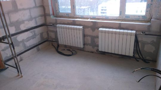 Монтаж отопления осуществлялся в два этапа, на первом этапе были осуществлены предварительные работы. На момент черновой отделки и окончания строительства дома, были смонтированы трассы из труб сшитого полиэтилена Rehau RAUTITAN pink и Rehau RAUTITAN stabil в стены и пол дома. Также осуществлена разметка и установка радиаторов Kermi Profil-K на стены. Далее была осуществлена опрессовка системы и проверка ее герметичности.